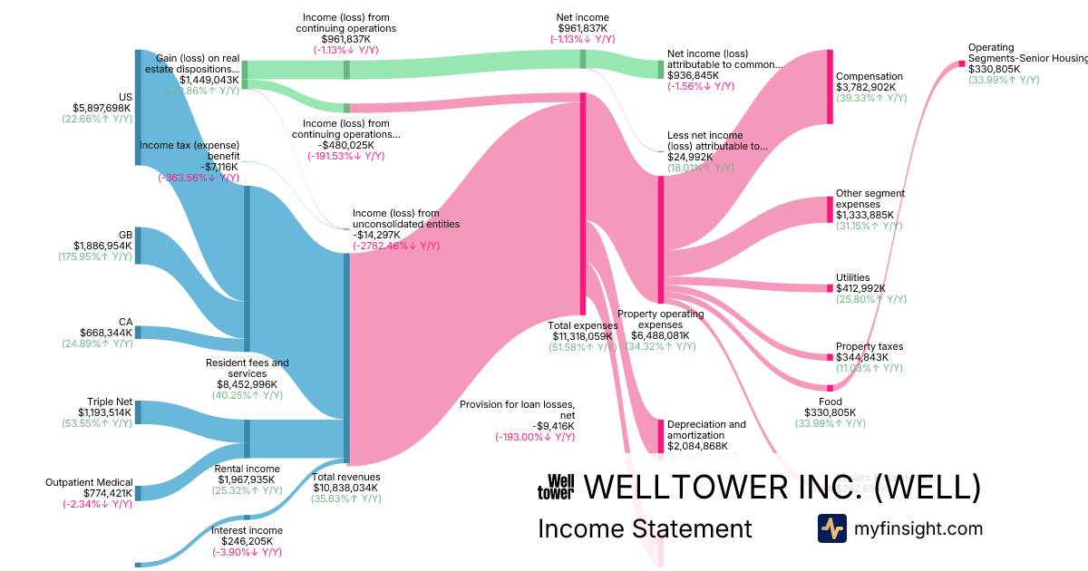 For the year ending 2025-12-31, WELL made $10,838,034K in revenue. $936,845K in net income. Net profit margin of 8.64%.