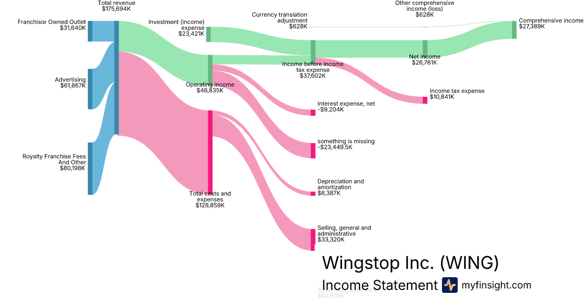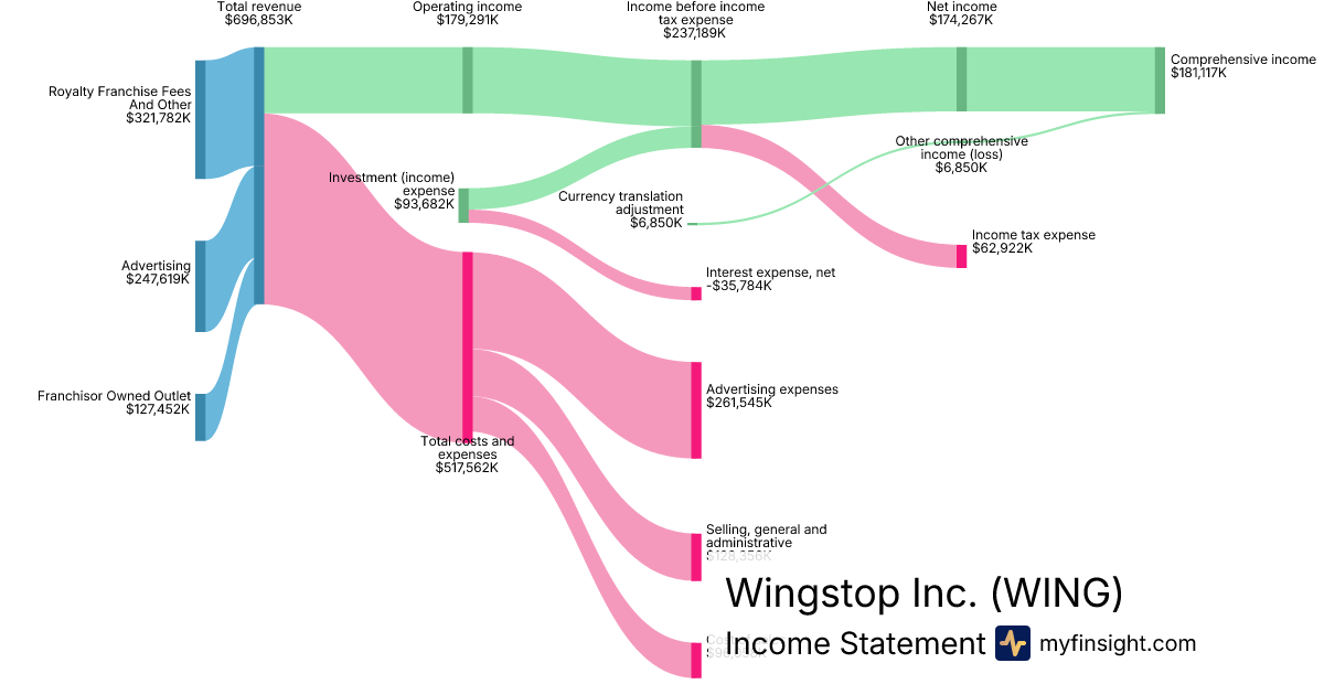 For the year ending 2025-12-27, WING made $696,853K in revenue. $181,117K in net income. Net profit margin of 25.99%.