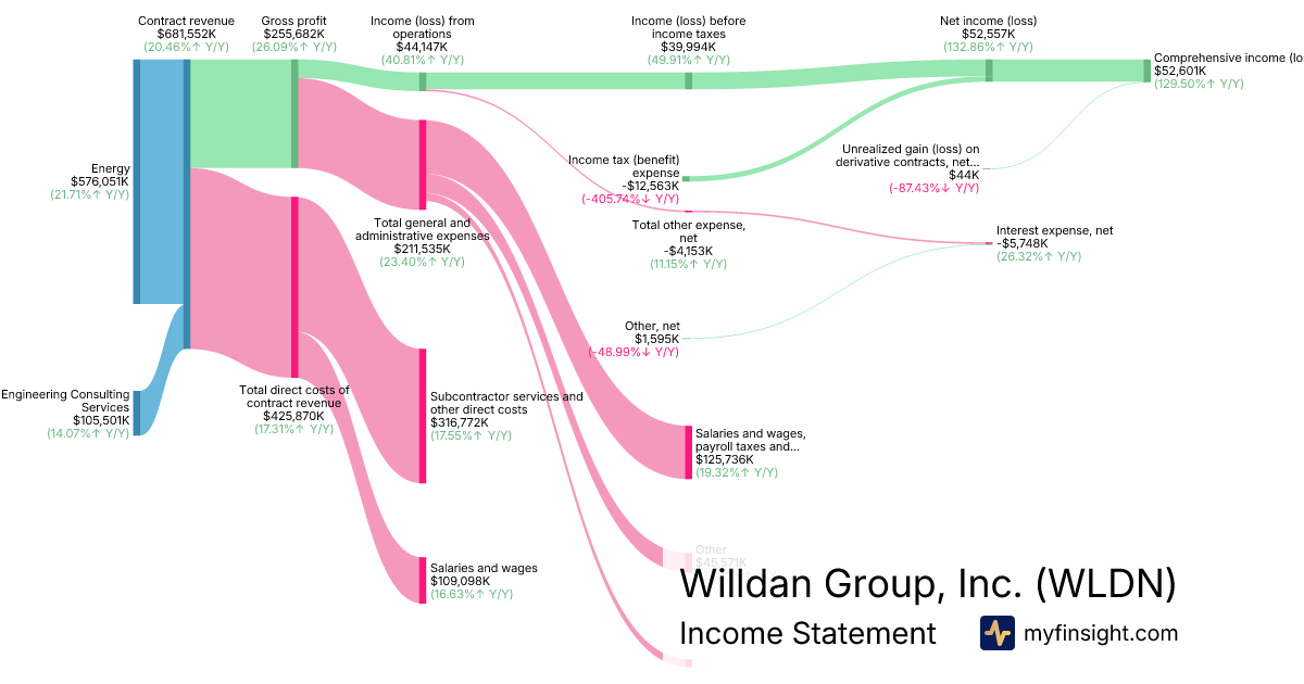 For the year ending 2026-01-02, WLDN made $681,552K in revenue. $52,601K in net income. Net profit margin of 7.72%.