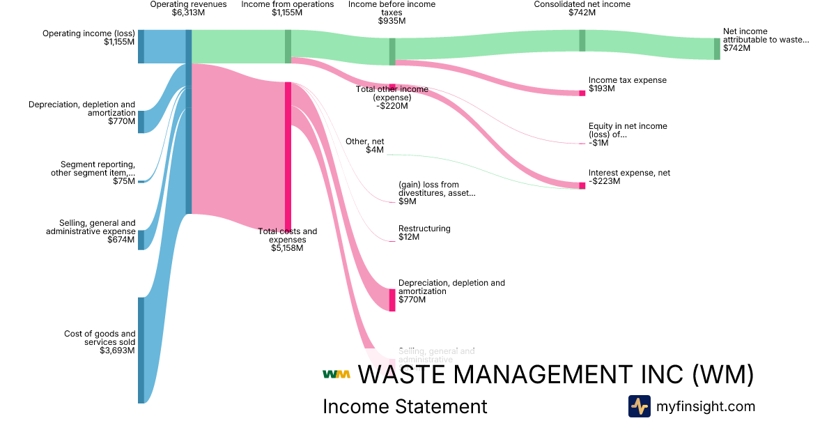 For the year ending 2025-12-31, WM made $25,204M in revenue. $2,708M in net income. Net profit margin of 10.74%.