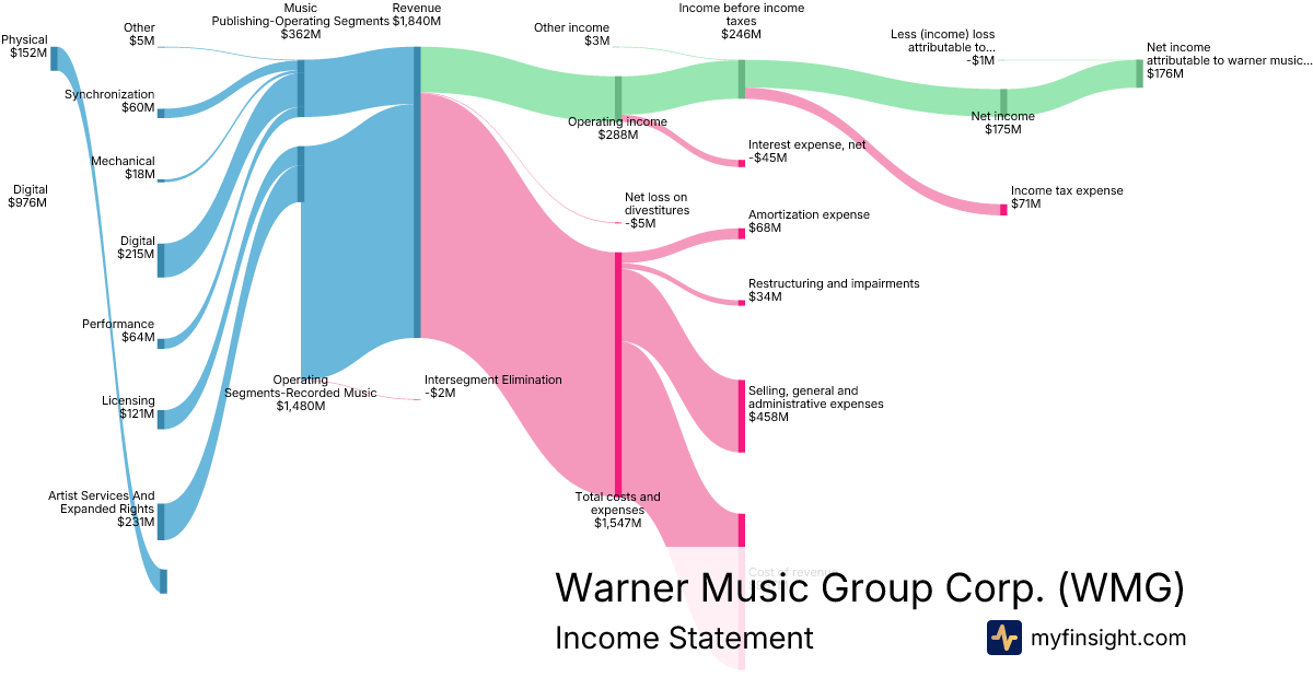 For the quarter ending 2025-12-31, WMG made $1,840M in revenue. $176M in net income. Net profit margin of 9.57%.