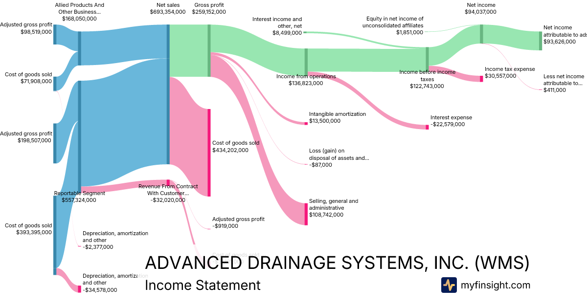 For the quarter ending 2025-12-31, WMS made $693,354,000 in revenue. $93,626,000 in net income. Net profit margin of 13.50%.