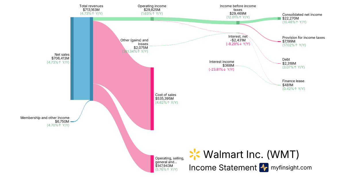 For the year ending 2026-01-31, WMT made $713,163M in revenue. $22,270M in net income. Net profit margin of 3.12%.