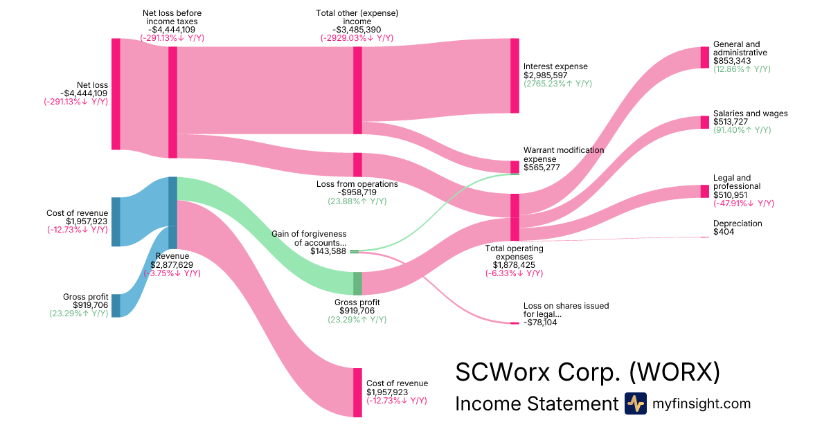 For the year ending 2025-12-31, WORX made $2,877,629 in revenue. -$4,444,109 in net income. Net profit margin of -154.44%.