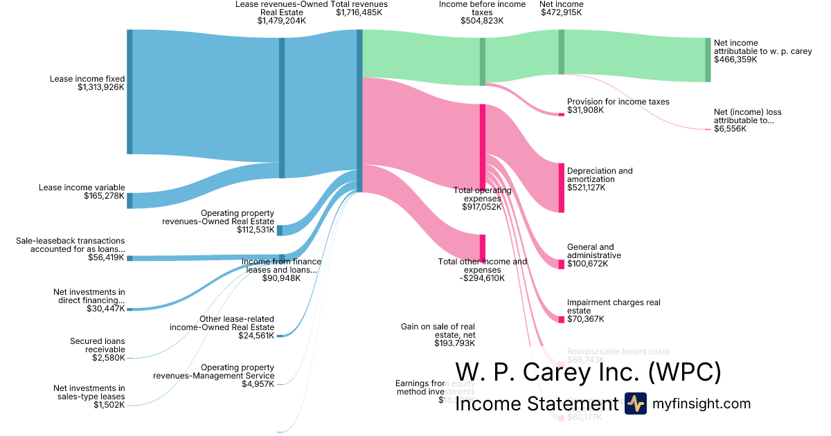For the year ending 2025-12-31, WPC made $1,716,485K in revenue. $466,359K in net income. Net profit margin of 27.17%.