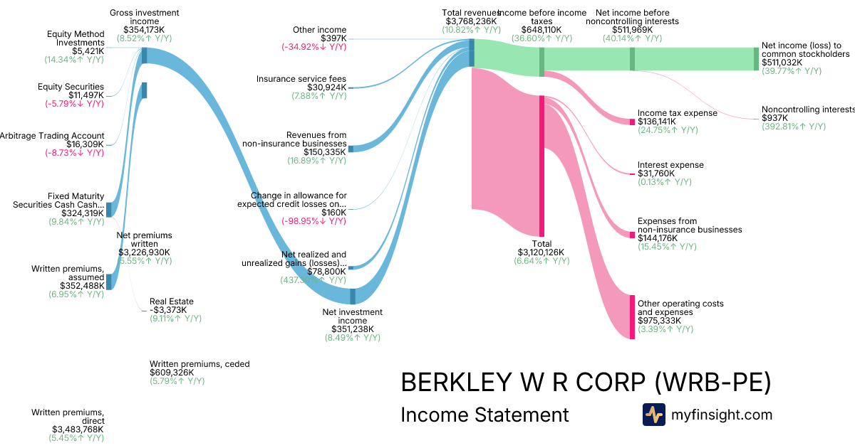For the quarter ending 2025-09-30, WRB-PE made $3,768,236,000 in revenue. $511,032,000 in net income. Net profit margin of 13.56%.