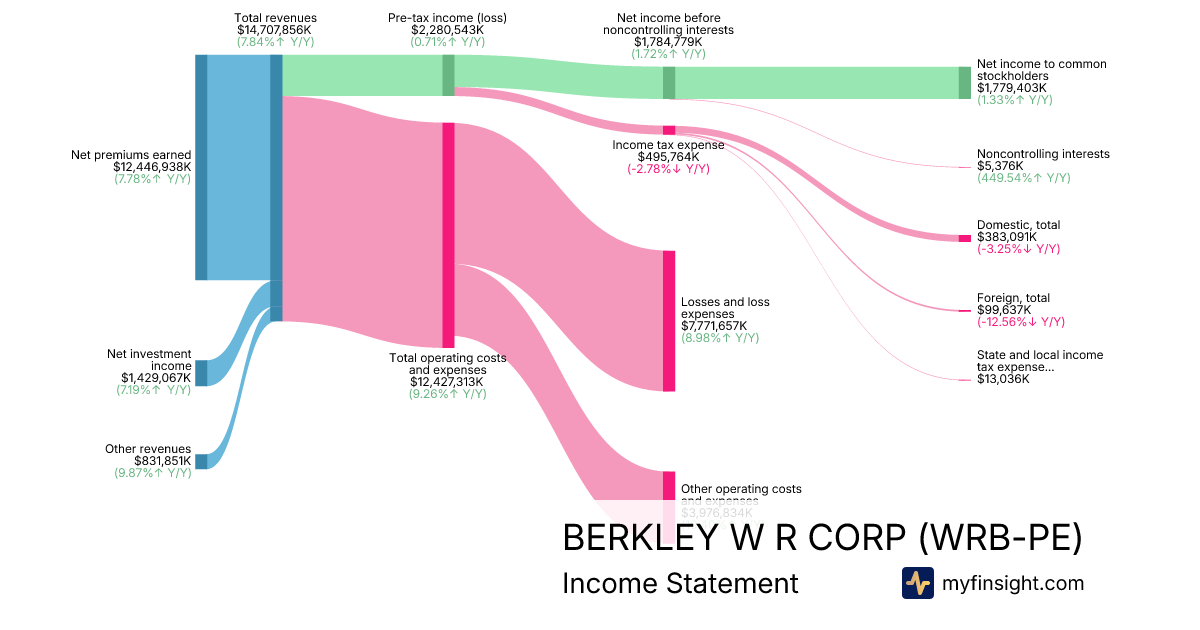 For the year ending 2025-12-31, WRB-PE made $14,707,856K in revenue. $1,779,403K in net income. Net profit margin of 12.10%.