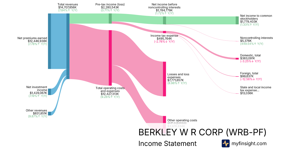 For the year ending 2025-12-31, WRB-PF made $14,707,856K in revenue. $1,779,403K in net income. Net profit margin of 12.10%.