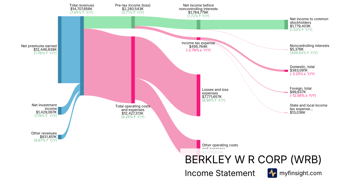 For the year ending 2025-12-31, WRB made $14,707,856K in revenue. $1,779,403K in net income. Net profit margin of 12.10%.