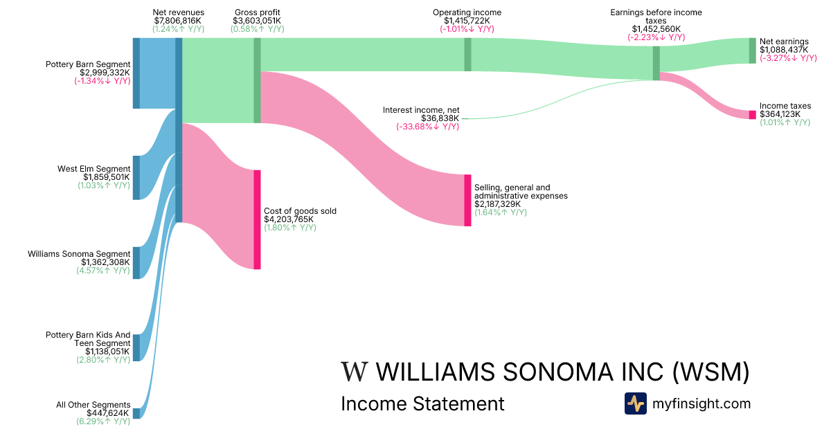 For the year ending 2026-02-01, WSM made $7,806,816K in revenue. $1,088,437K in net income. Net profit margin of 13.94%.