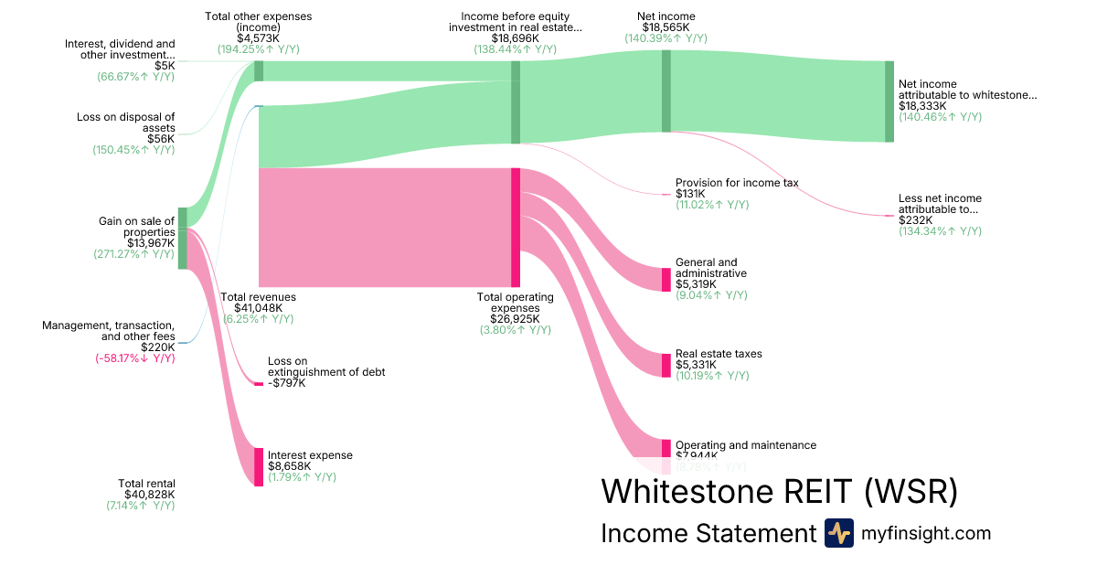 For the quarter ending 2025-09-30, WSR made $41,048K in revenue. $18,333K in net income. Net profit margin of 44.66%.