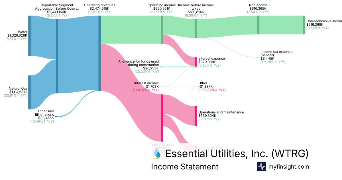 For the year ending 2025-12-31, WTRG made $2,474,615K in revenue. $616,369K in net income. Net profit margin of 24.91%.