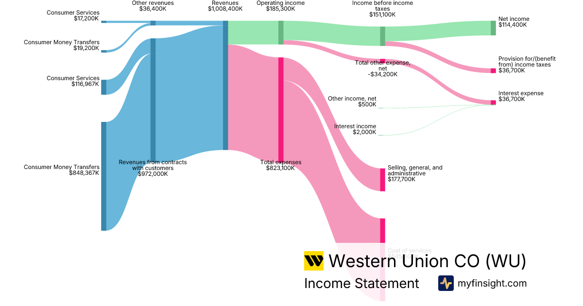 For the year ending 2025-12-31, WU made $4,050,700K in revenue. $499,600K in net income. Net profit margin of 12.33%.