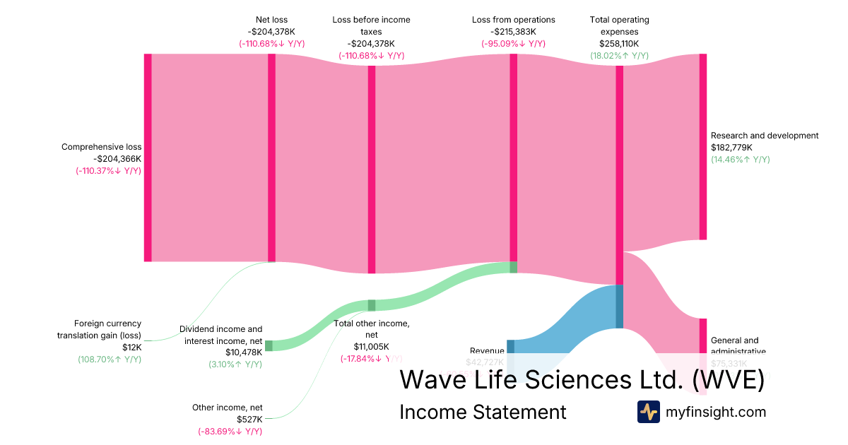 For the year ending 2025-12-31, WVE made $42,727K in revenue. -$204,366K in net income. Net profit margin of -478.31%.