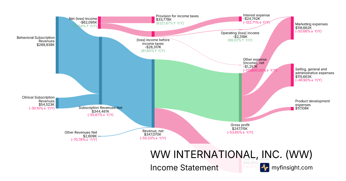 For the year ending 2025-12-31, WW made $347,070K in revenue. -$62,095K in net income. Net profit margin of -17.89%.