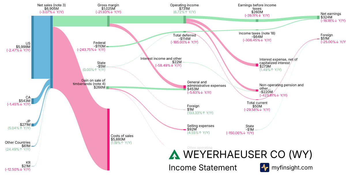 For the year ending 2025-12-31, WY made $6,905M in revenue. $324M in net income. Net profit margin of 4.69%.