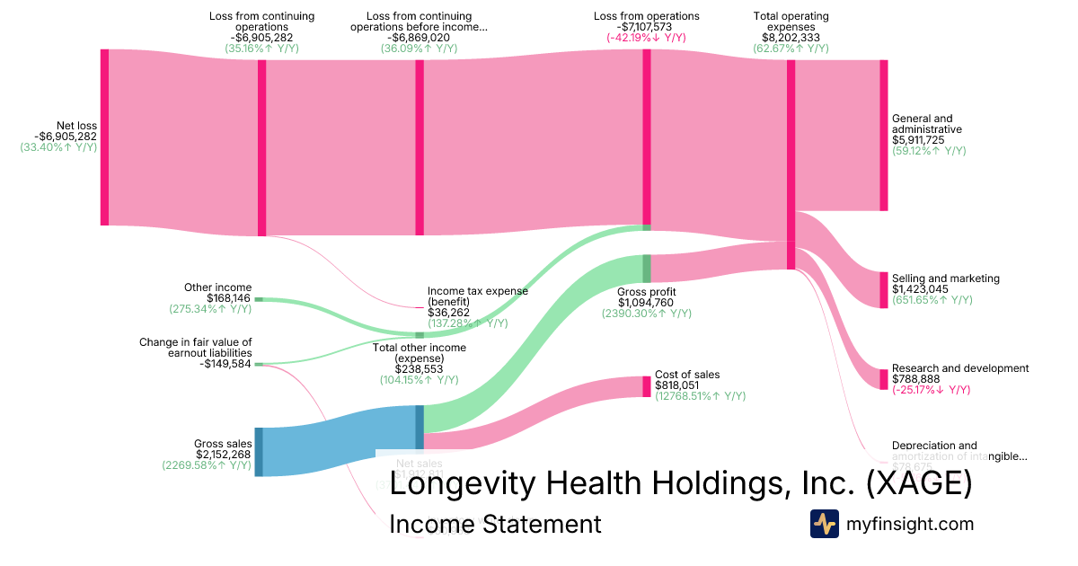 For the year ending 2025-12-31, XAGE made $1,912,811 in revenue. -$6,905,282 in net income. Net profit margin of -361.00%.