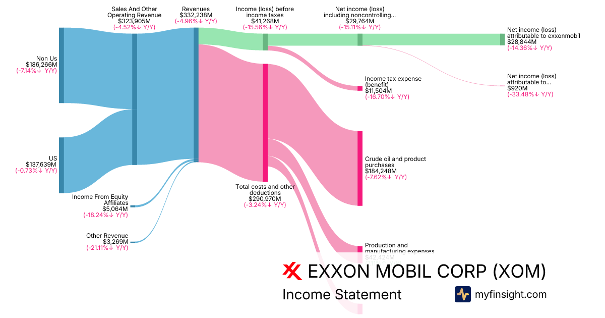 For the year ending 2025-12-31, XOM made $332,238M in revenue. $28,844M in net income. Net profit margin of 8.68%.