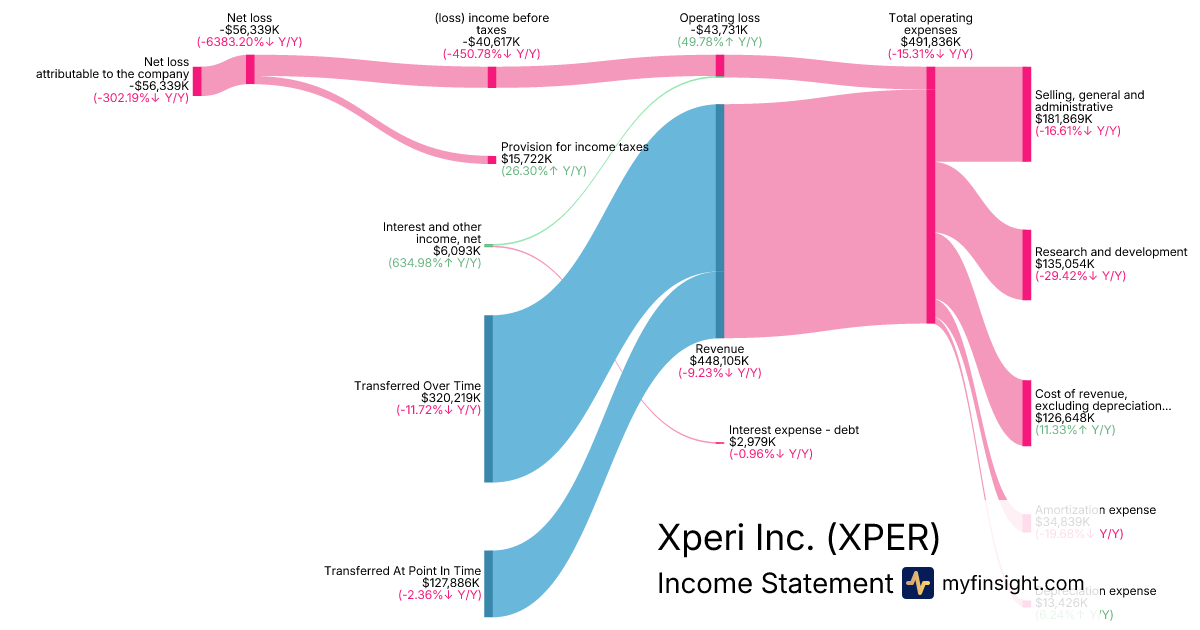 For the year ending 2025-12-31, XPER made $448,105K in revenue. -$56,339K in net income. Net profit margin of -12.57%.