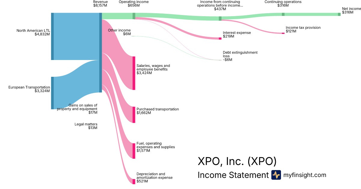 For the year ending 2025-12-31, XPO made $8,157M in revenue. $316M in net income. Net profit margin of 3.87%.