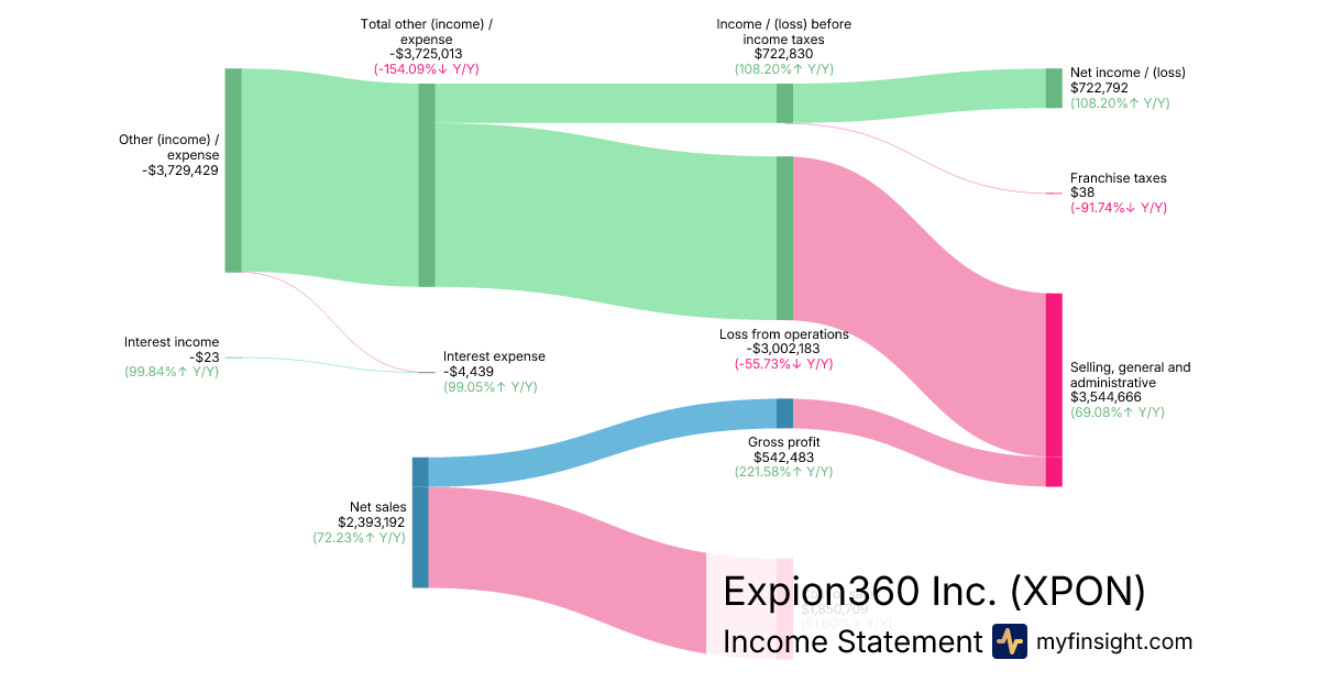 For the quarter ending 2025-09-30, XPON made $2,393,192 in revenue. $722,792 in net income. Net profit margin of 30.20%.