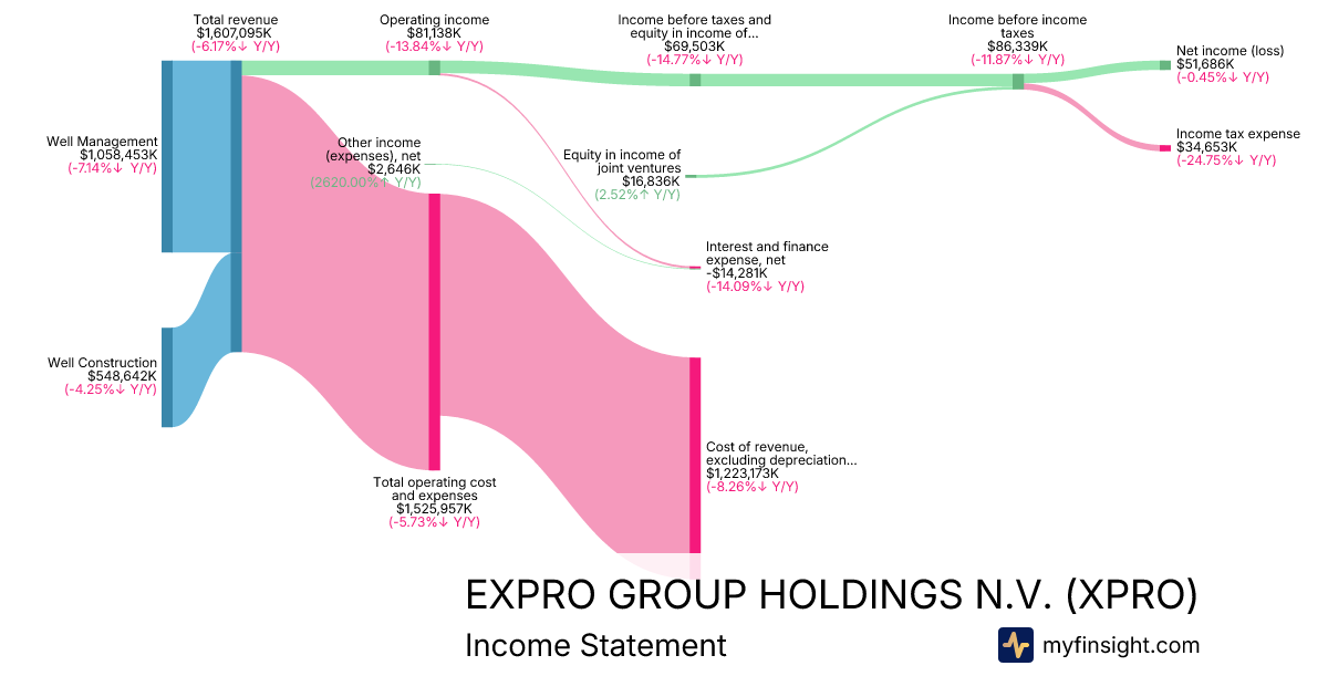 For the year ending 2025-12-31, XPRO made $1,607,095K in revenue. $51,686K in net income. Net profit margin of 3.22%.