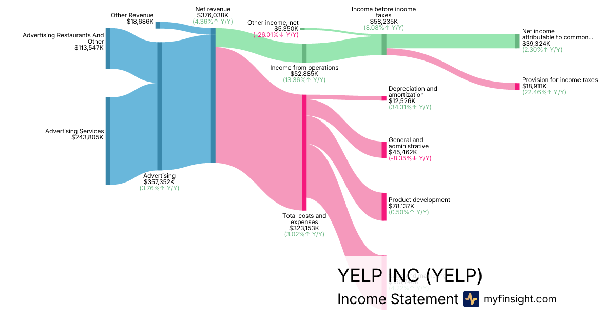 For the quarter ending 2025-09-30, YELP made $376,038K in revenue. $39,324K in net income. Net profit margin of 10.46%.