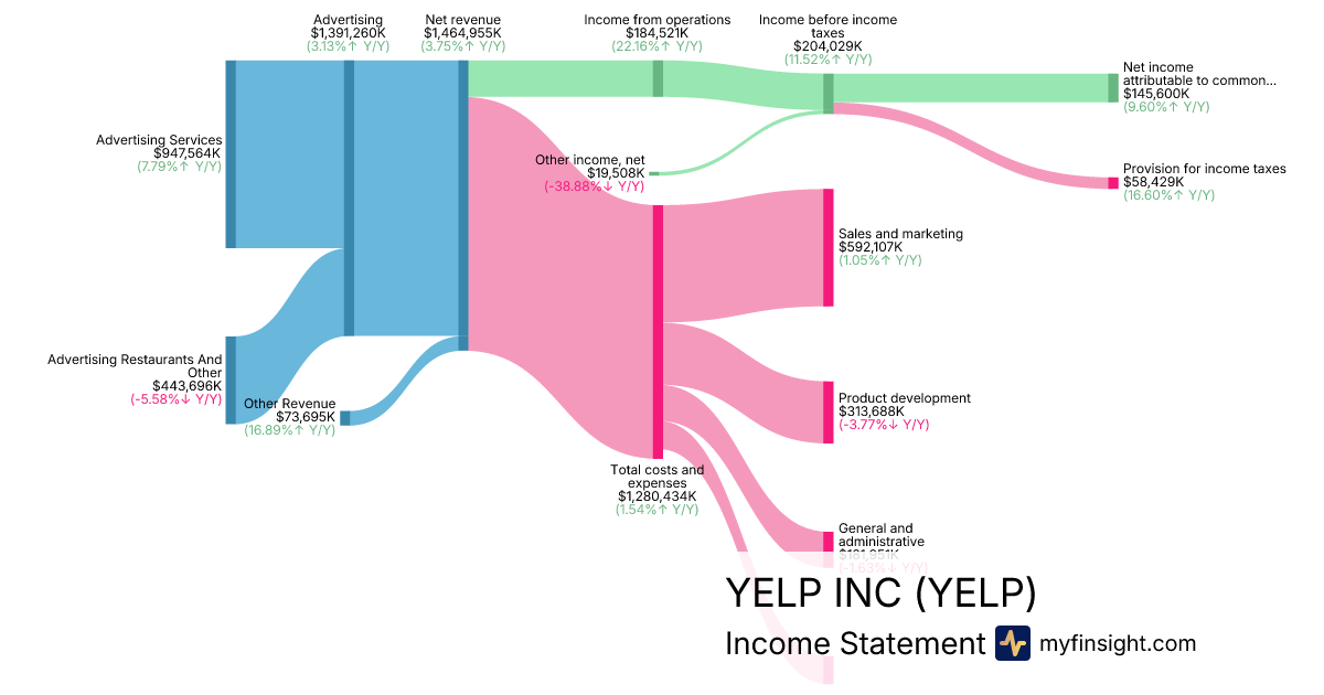 For the year ending 2025-12-31, YELP made $1,464,955K in revenue. $145,600K in net income. Net profit margin of 9.94%.
