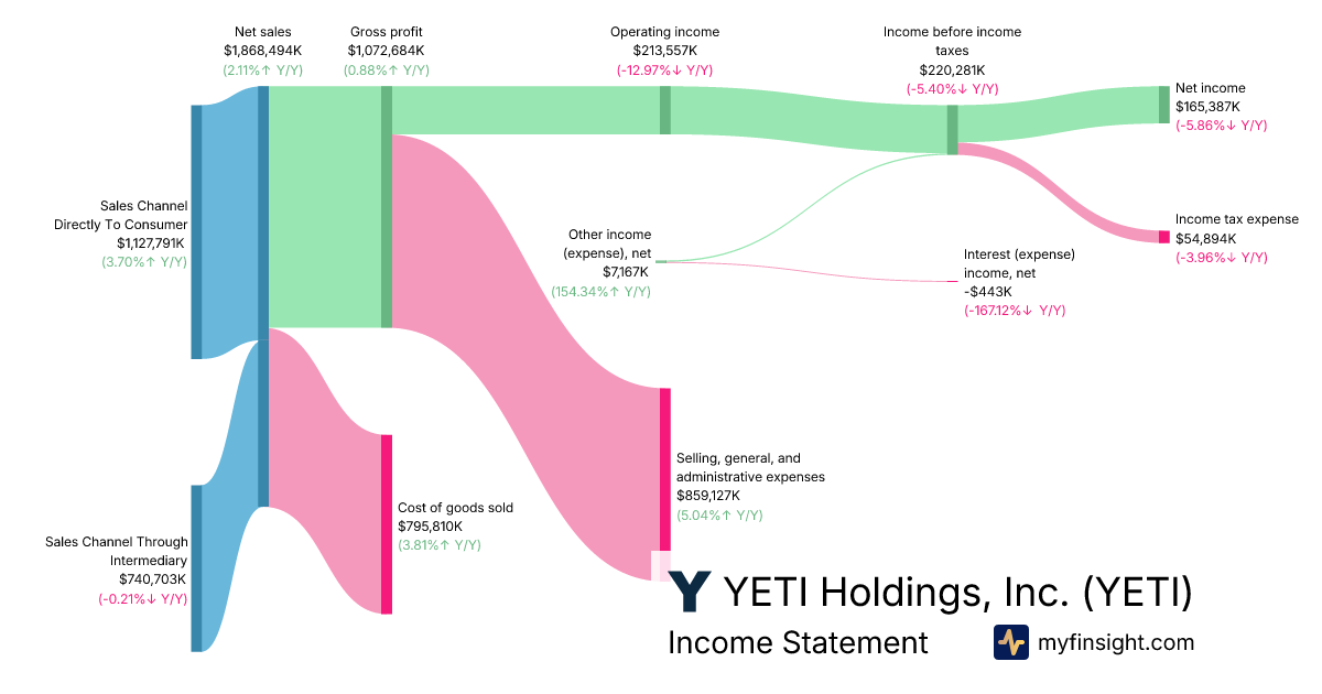 For the year ending 2026-01-03, YETI made $1,868,494K in revenue. $165,387K in net income. Net profit margin of 8.85%.