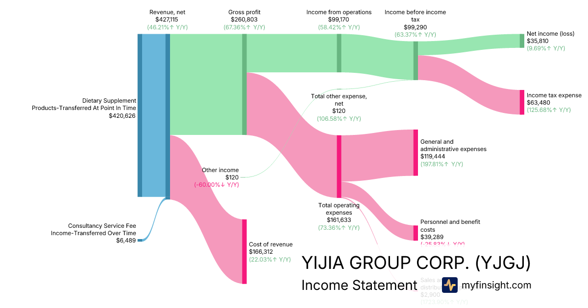 For the quarter ending 2025-10-31, YJGJ made $427,115 in revenue. $35,810 in net income. Net profit margin of 8.38%.