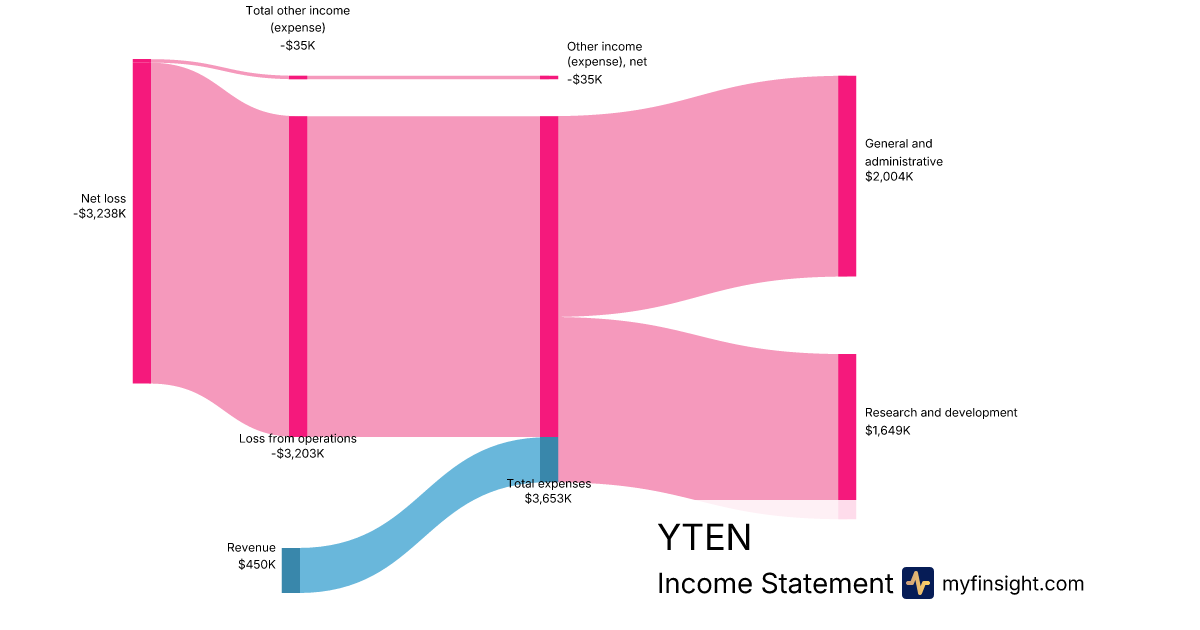 For the quarter ending 2024-06-30, YTEN made $450K in revenue. -$3,238K in net income. Net profit margin of -719.56%.