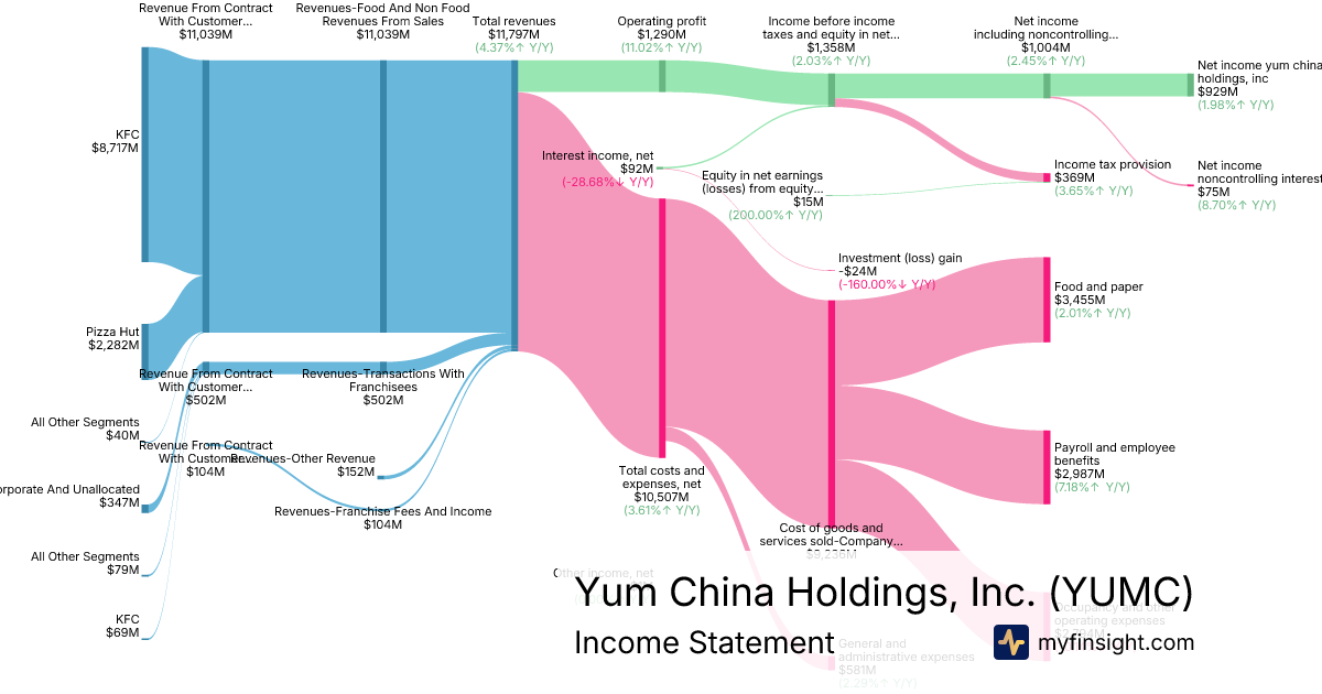 For the year ending 2025-12-31, YUMC made $11,797M in revenue. $929M in net income. Net profit margin of 7.87%.