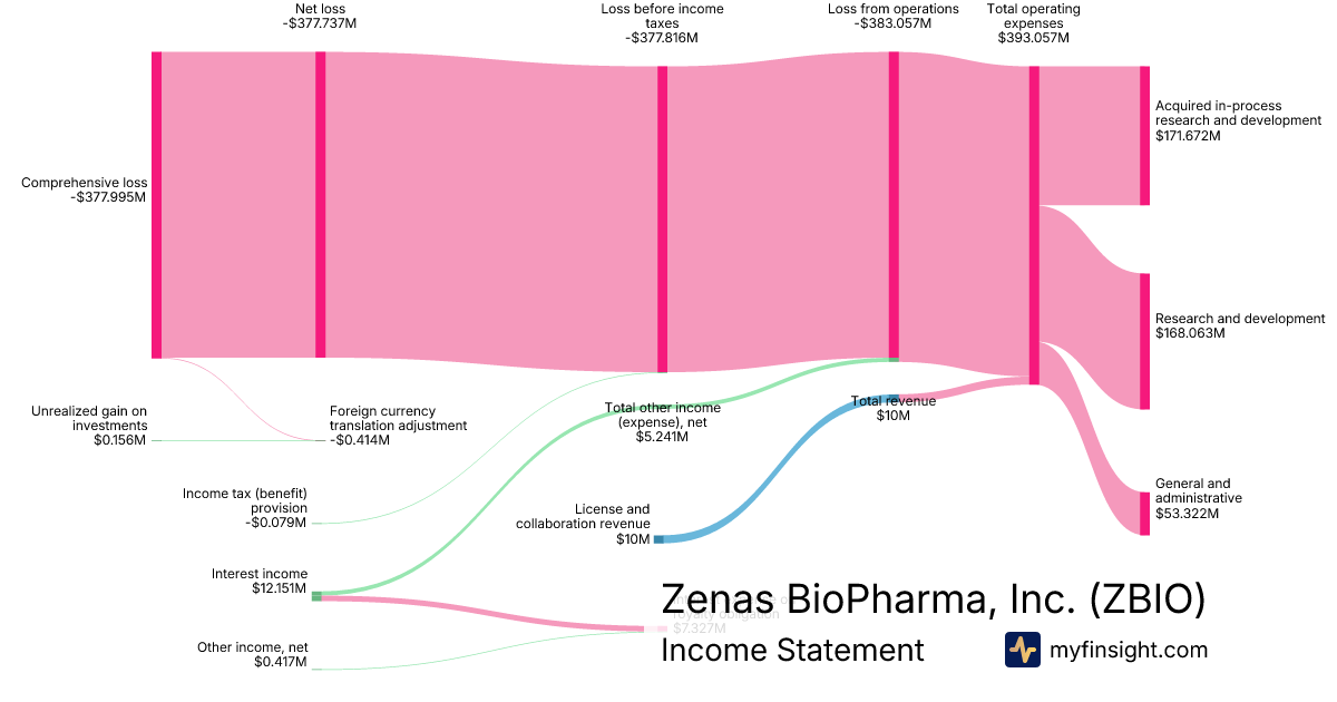For the year ending 2025-12-31, ZBIO made $10M in revenue. -$377.995M in net income. Net profit margin of -3779.95%.