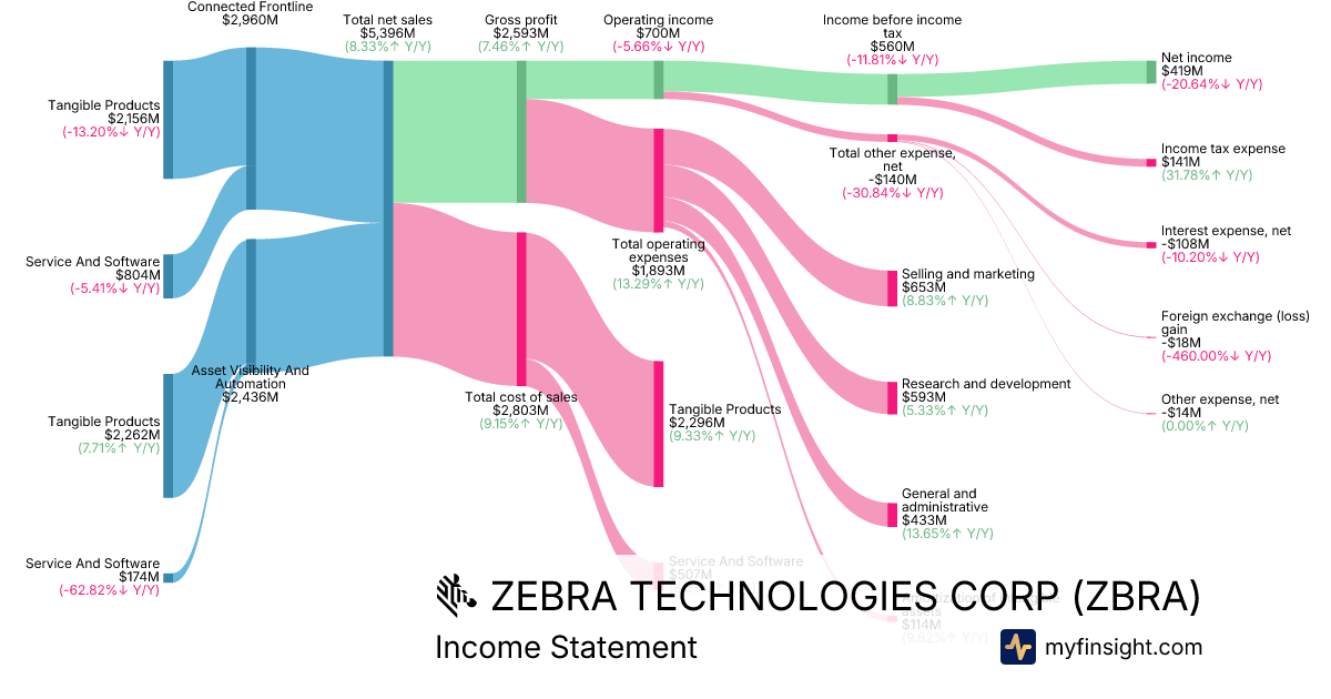 For the year ending 2025-12-31, ZBRA made $5,396M in revenue. $419M in net income. Net profit margin of 7.77%.