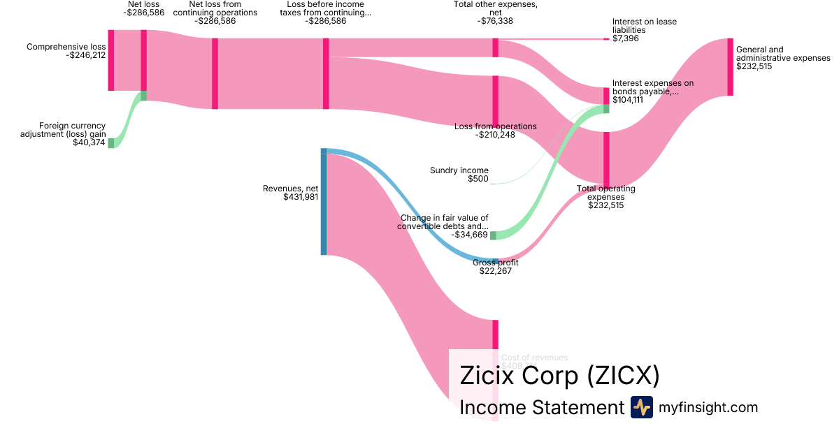 For the quarter ending 2025-12-31, ZICX made $431,981 in revenue. -$246,212 in net income. Net profit margin of -57.00%.