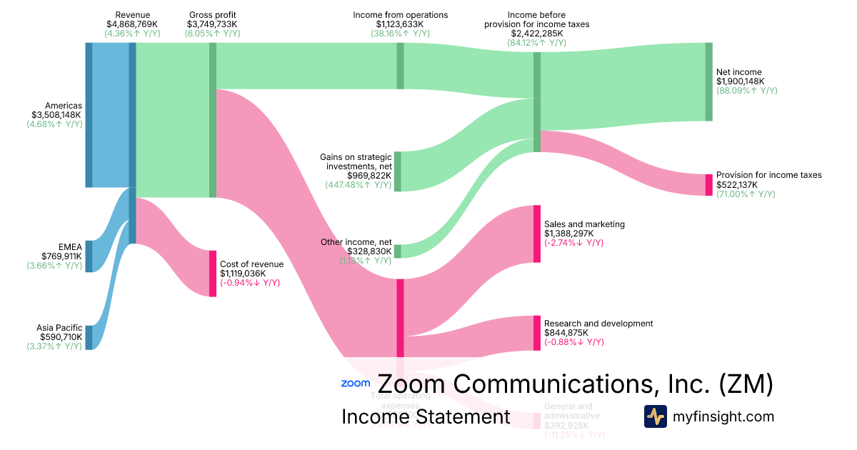 For the year ending 2026-01-31, ZM made $4,868,769K in revenue. $1,900,148K in net income. Net profit margin of 39.03%.