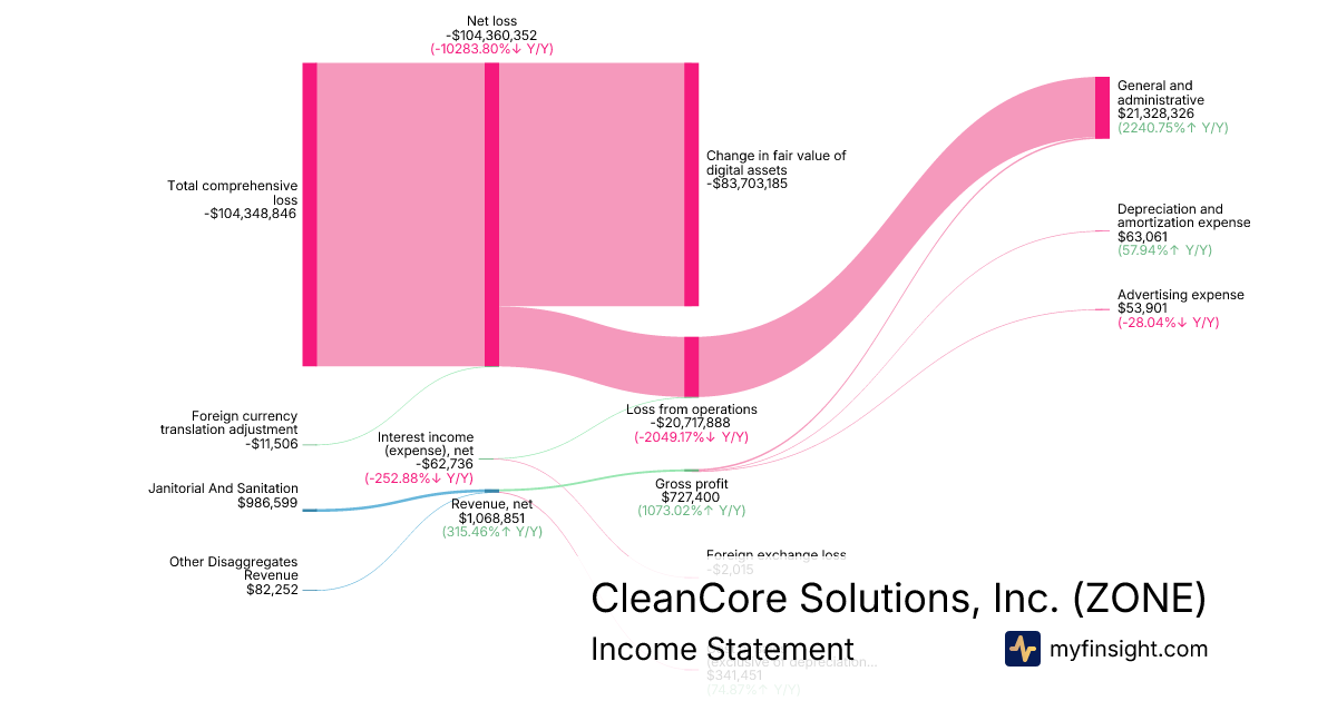 For the quarter ending 2025-12-31, ZONE made $1,068,851 in revenue. -$104,348,846 in net income. Net profit margin of -9762.71%.