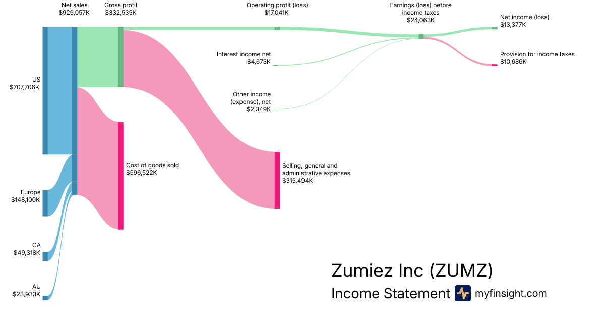 For the year ending 2026-01-31, ZUMZ made $929,057K in revenue. $13,377K in net income. Net profit margin of 1.44%.