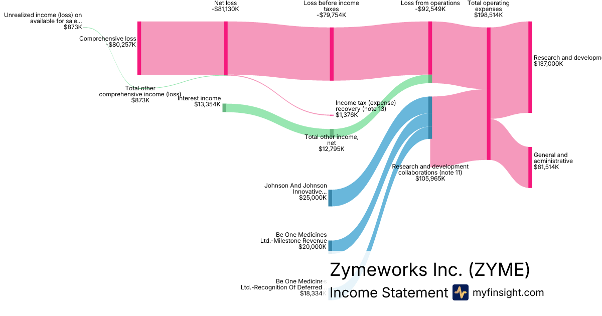 For the year ending 2025-12-31, ZYME made $105,965K in revenue. -$80,257K in net income. Net profit margin of -75.74%.